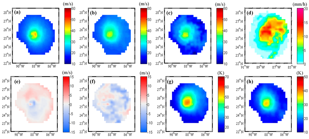 (a) H*wind wind speed of Rita on 22 September 2005, at 1330 UTC; (b) Retrieved wind speed of Rita with our new model on22 September 2005, at 1155 UTC; (c) RSS all-weather wind speed of Rita on 22 September 2005, at 1155 UTC; (d) RSS rain rate of Rita on 22 September 2005, at 1155 UTC; (e) The bias between H*wind and Retrieved wind speed with our new model; (f) The bias between H*wind and RSS all-weather wind speed; (g) W6H over Rita on 22 September 2005, at 1155 UTC; (h) W6V over Rita on 22 September 2005, at 1155 UTC.