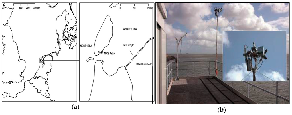 (a) The location at the NIOZ jetty sampling station in the western part of the Dutch Wadden Sea [54]; (b) The optical system mounted on a pole on the platform of the NIOZ jetty in the Wadden Sea [53].