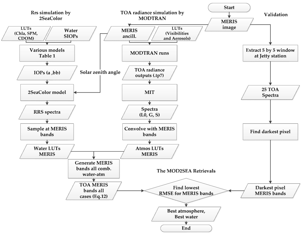 The developed MOD2SEA method combined two lookup tables (LUTs) from 2SeaColor and MODTRAN as schematically shown in Figure 3.