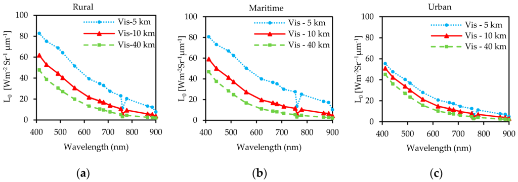 TOA radiance simulated by MODTRAN for (a) rural; (b) maritime and (c) urban aerosol types respectively.