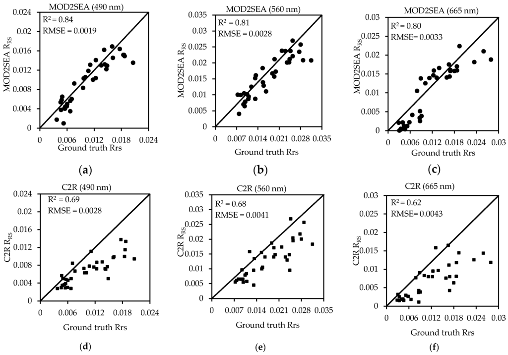The comparisons of C2R and MOD2SEA Chla retrieval against ground truth measurements are shown in Figure 7 and related statistical analysis are presented in Table 5.