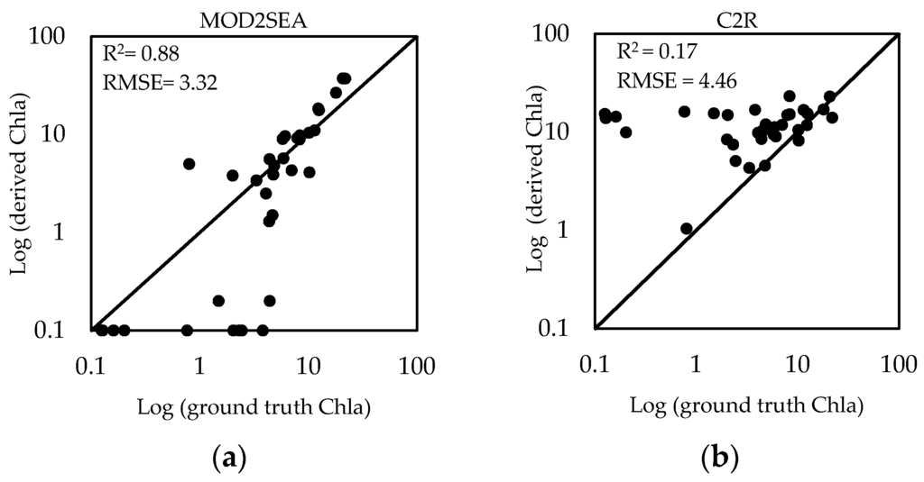 Comparison between MERIS-derived and measured log Chla (mg·m−3) for 35 matchup moments. (a) MOD2SEA and (b) C2R.