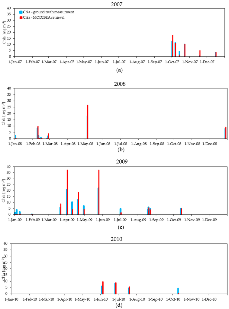 (a–d) The four-year comparison of derived Chla values using the coupled MOD2SEA model (red line) and ground truth measurements (blue line) (mg·m−3) from 2007−2010 at matchup moments.