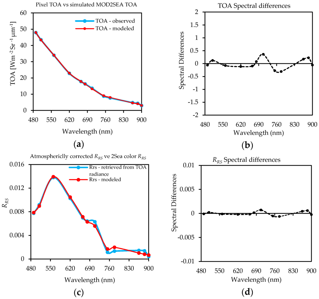 (a) The best match identified by the coupled model between simulated TOA radiances vs. pixel TOA radiance; (b) Spectral differences between observed and simulated TOA radiance; (c) The simulated RRS (extracted from the best TOA radiance match) vs. the simulated 2SeaColor RRS; (d) Spectral differences between simulated RRS by 2SeaColor and atmospherically corrected RRS from observed TOA radiance by MOD2SEA.