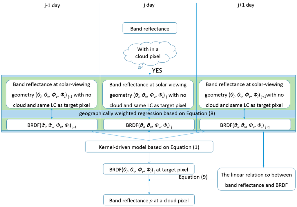 With the aim of retrieving spectral reflectance for MODIS the band of cloudy pixels with a higher accuracy, this study made use of multi-temporal data extracted from MODIS observations (e.g., spectral reflectance for MODIS band and solar-viewing geometry) and the MODIS BRDF (MCD43A1 V005) to retrieve MODIS surface reflectance (MOD09GA) of cloudy pixels based on GWR. Compared with other existing methods, the proposed method offers several improvements, i.e., the method: (1) applies an algorithm that retrieves land surface albedo to retrieve the spectral reflectance for MODIS band of cloudy pixels, which improves the accuracy and applicability of the method compared with existing methods; (2) constructs sample reflectance pairs from the observed data and the data calculated with the BRDF to eliminate errors from the anisotropic bidirectional reflectance distribution of a land surface; (3) introduces GWR and optimizes the samples of the driving data to eliminate the error arising from spatial heterogeneity; and (4) includes a more comprehensive evaluation scheme with the criterion of quantitative remote sensing to ensure that the results have sufficient precision. An experiment was conducted in the Heihe River Basin to validate the method. Section 2 introduces the theoretical basis and the details of the procedure to derive the Terra MODIS data. Section 3 introduces the study area and the data. In Section 4, the results of applying the proposed method to the study area are described. Section 5 proposes a comprehensive evaluation scheme and discusses the accuracy of the proposed method by comparing it with other methods (e.g., WCGF, Lin, and VJB). Section 6 discusses the limitations of the proposed method and future improvements to enhance it.