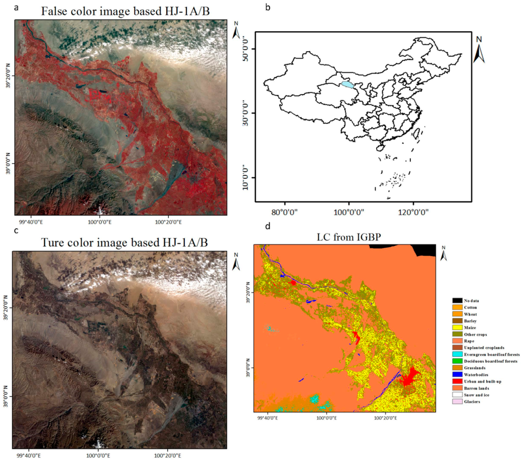 The Heihe River Basin study area is situated in Northwest China: (a) a false color image from 25 September 2012; (b) a map of China highlighting the location of the river basin; (c) a true color image from 25 September 2012; and (d) the land cover of the region in 2012.