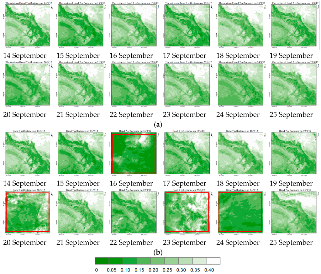 Based on the proposed method, an experiment was conducted in the Heihe River Basin. The proposed method was used for the cloudy pixels in the TERRA MODIS MOD09GA data. Moreover, we retrieved the Terra MODIS band 7 reflectance with clouds on the Heihe River Basin for 14–25 September 2012 (Figure 3).