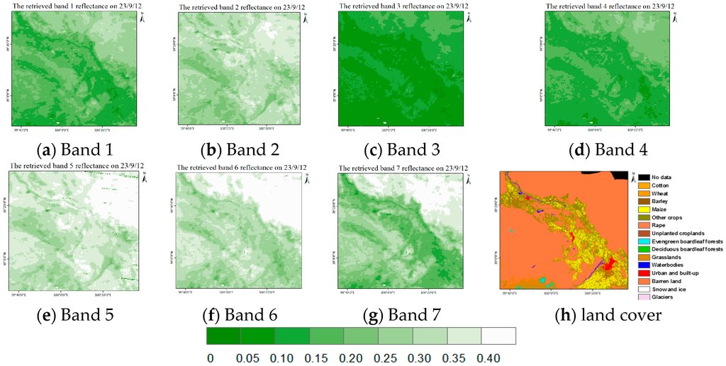 (a–g) The spatial distribution of the retrieved spectral reflectance for MODIS band 1–7 on 23 September 2012; and (h) the corresponding land cover data.
