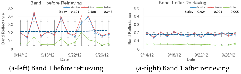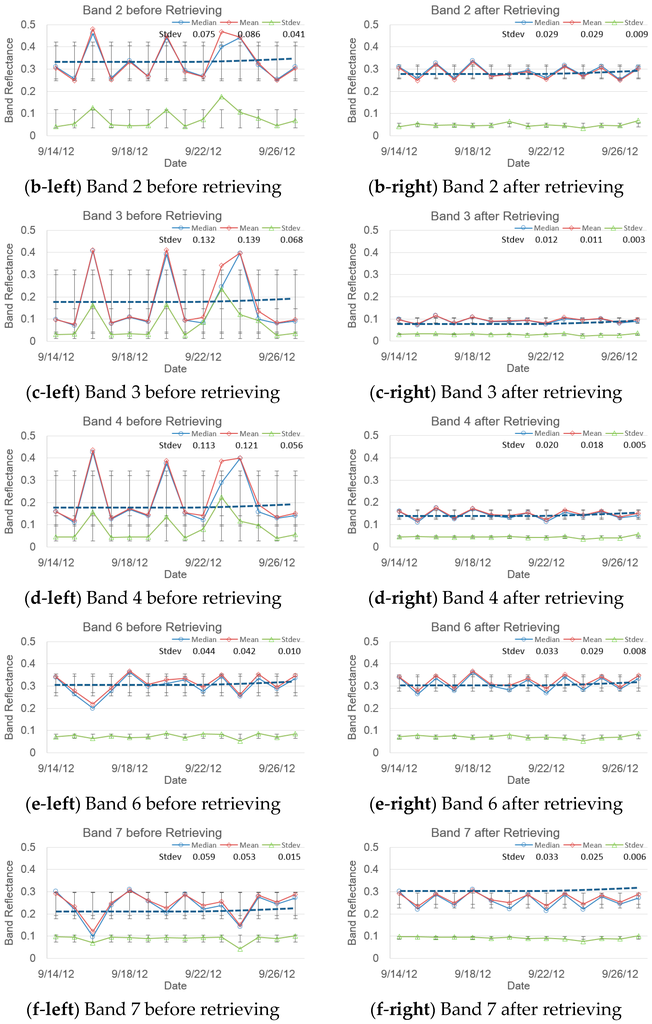 To further analyze the improved results of the proposed method, two time series from 14 September to 27 September 2012 (the observed and the retrieved values) were constructed and compared. Based on Figure 3, the spectral reflectance for MODIS band included clouds at different levels on all days, resulting in a dramatic fluctuation in the statistical indices (e.g., the median, mean, and standard deviation) through time. However, the reflectance values of bands 1, 2, 3, 4, 6, and 7 are expected to be stable in September, judging from the phenological rule. Therefore, a trend of slow growth will appear as the chlorophyll in the vegetation as well as the soil moisture decrease, as shown by the blue trendline in Figure 5.