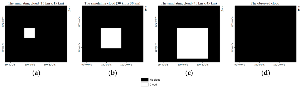 The simulated cloud areas: (a) 15 km × 15 km; (b) 30 km × 30 km; and (c) 45 km × 45 km; and (d) the observed cloud product from MODIS.