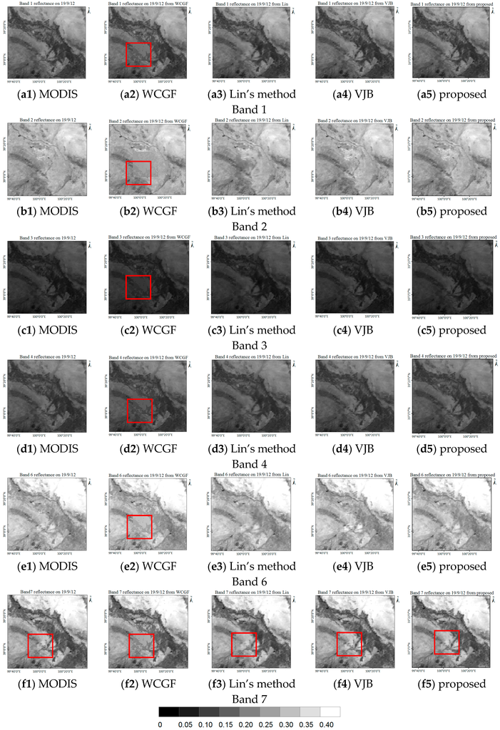 Figure 7 shows the results from the four methods based on the simulated cloud areas presented in Figure 6b in order to validate the precision of the proposed method. The results from WCGF show the worst spatial distribution among the four methods, while the other three methods had a similar spatial distribution. The red square encompasses both the simulated cloud region and the no-cloud region, and unreasonable spatial variations in the magnitude appear along the boundary of the simulated cloud region and the no-cloud region when using WCGF. Meanwhile, the spatial distribution of the result obtained from the proposed method and VJB method appears to be more similar to the MODIS reflectance than the result obtained from Lin’s method (the red square area in Figure 7). Statistics on the precision of the four methods are shown in Figure 8.