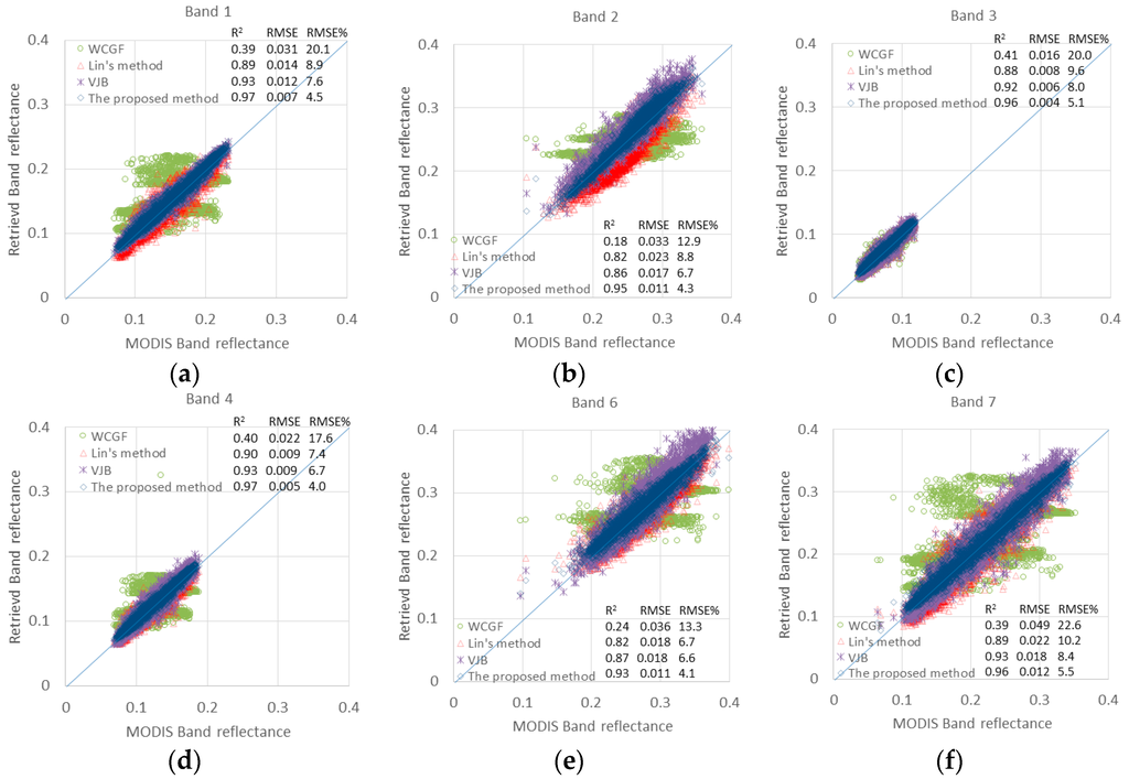 The 2D scattering plots show the precision statistics between the spectral reflectance for MODIS bands and the retrieved spectral reflectance for MODIS bands using the four methods in the simulated cloud area from Figure 6b: (a–f) MODIS bands 1, 2, 3, 4, 6, and 7 (Band 5 is not used because of bad stripe).