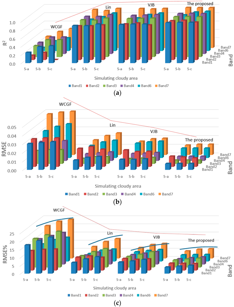 Table 1 and Figure 9 demonstrate that the results from the proposed method has the best and most stable precision of the four methods and that the statistical accuracy (e.g., R2, RMSE, and RMSE%) do not significantly diminish with larger simulated cloudy areas, which means that the proposed method is very robust owing to its physical mechanism and strict retrieving control. Furthermore, other methods based on mathematical statistics may not be stable in enlarged cloudy area.