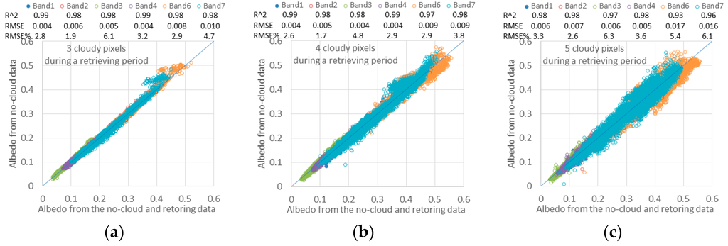 2D scattering plots of the band white-sky albedo retrieved from no-cloud data and mixed data including no-cloud and restored cloudy pixels according to the different number of the cloudy pixels: (a) 3; (b) 4; and (c) 5.
