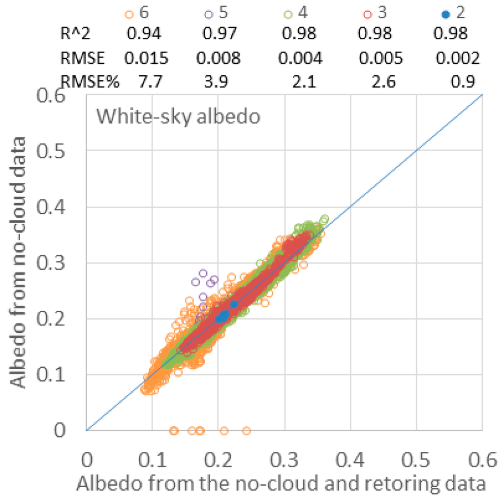 The result is shown in Figure 12, assuming that the albedo retrieved using the no-cloud data is the true value and converting the spectral albedo for the MODIS band to shortwave albedo. With the restored cloudy data, which were used when the number of cloudy pixels increased from 2 to 5 (accounting for approximately 80% of the total area), the precision of the retrieved albedo shows fluctuations in the RMSE% from 0.9% to 3.9% and R2 from 97% to 98%. The total precision of the method is high, with a total RMSE% of 3.1% and a total bias% of 2.0%. Considering the condition of the six restored cloudy data used to retrieve the albedo, the worst precision of the retrieved albedo is with an RMSE% of 7.7% and an R2 of 94%; however, the total RMSE% of 3.6% and total bias% of 2.2% are still very accurate and stable, because the conditions of the six restored cloudy data used to retrieve the albedo only account for approximately 6% of the total.