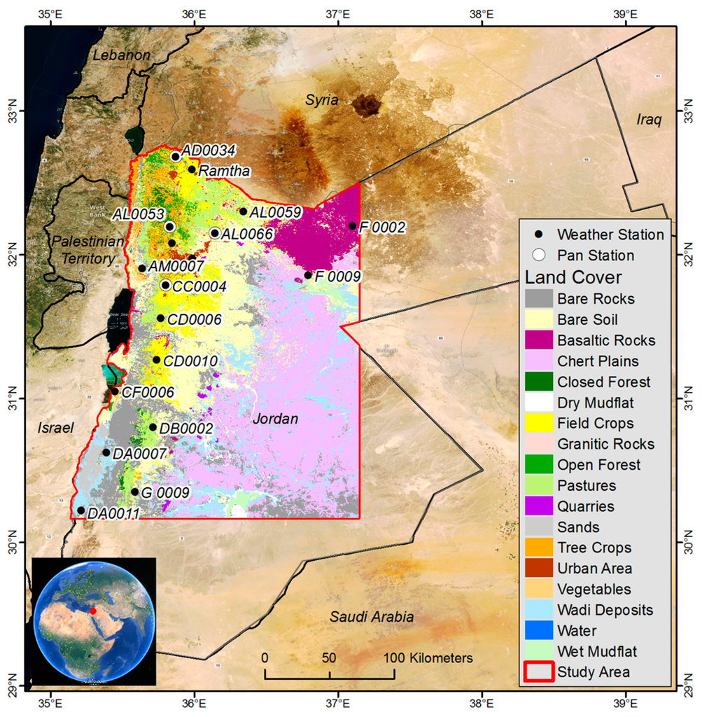 - Al-Bakri, J.T. Mapping Irrigated Crops and Their Water Consumption in Yarmouk Basin; Jordan Ministry of Water and Irrigation: Amman, Arab, 2015.
