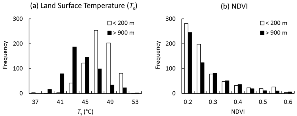 Histograms of (a) land surface temperature and (b) NDVI on 13 August of 2009 in two elevation zones, below 200 m and above 900 m, respectively. Considering the period 1970 to 2013, 2009 was an average rainfall year.