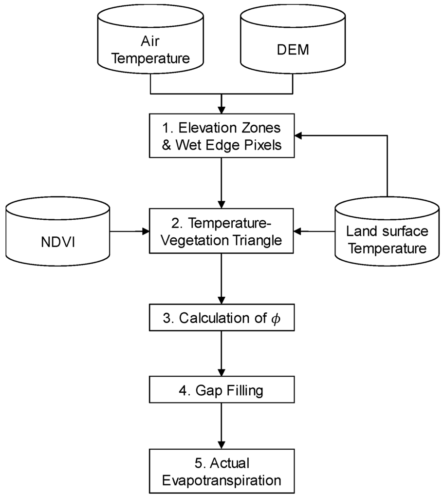 A variety of remote sensing methods with varying complexity have been developed to generate regional AET estimates based on surface energy balance or vegetation status. Among these approaches, the temperature-vegetation triangle method and its variants [6,7,8,9,10] have been widely used in different regions and across different sensors [11,12,13,14,15]. They are efficient methods that use the triangular geometry of the pixel distribution in surface temperature-vegetation fraction space to establish boundary conditions for the solution of equations for surface energy budget models [16]. These methods provide an efficient means to estimate a combined-effect parameter φ, which is derived from the Priestley-Taylor equation and accounts for aerodynamic and surface resistance, vapor pressure gradient, and soil moisture availability, based on satellite images [10,14,17]. The triangle methods only require satellite images of vegetation indices (e.g., normalized difference vegetation index or NDVI) and land surface temperature (Ts), and yet can yield accuracies comparable to more complex methods [18].