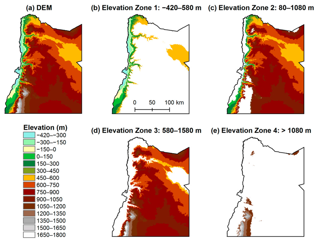 The discretization of (a) the digital elevation model into (b–e) four overlapping elevation zones.