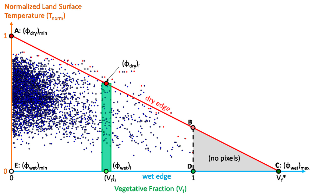 It is assumed that soil moisture availability varies linearly between the dry and wet edges within a certain NDVI range. Therefore, the value of the parameter φ for a pixel i can be estimated based on the location of this pixel, [(Tnorm)i, (Vf)i], in the temperature-vegetation space: