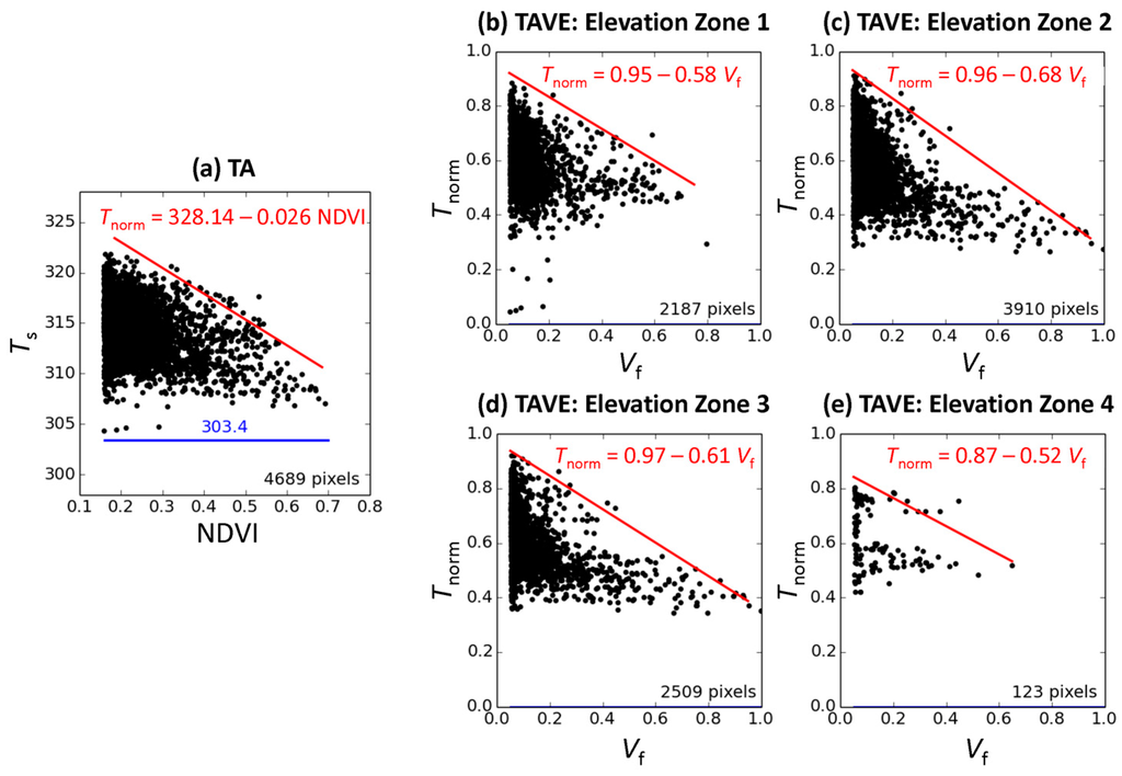 Comparison of temperature-vegetation triangles generated from (a) TA (a single triangle) and TAVE with four elevation zones: (b) −420 m–580 m, (c) 80 m–1080 m, (d) 580 m–1580 m, and (e) above 1080 m. In (b–e), Tnorm and Vf denote normalized land surface temperature and vegetative fraction, respectively. Red lines are linear regressions fits to the dry edges. In (a), the wet edge is indicated by the blue line. In (b–e), the wet edge is located on horizontal axis at Tnorm = 0. The number of pixels included in the triangle is shown on the lower right corner of each graph. Note that the total number of pixels in the four triangles of TAVE is larger than the number of pixels in the triangle of TA, because most of the pixels are involved in two overlapping elevation zones in TAVE.