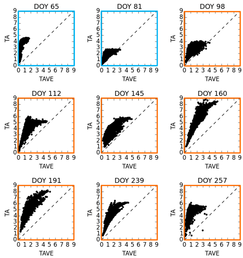 Comparison of the AET estimates derived by TAVE and TA over nine selected days of year (DOY). AET is in mm/day. DOY 65 and 81 are representative days of the wet season from October to March (blue frame). DOY 98, 112, 145, 160, 191, 239, and 257 are representative days of the dry season from April to September (orange frame). The dashed line is the 1:1 line of perfect agreement between TA and TAVE.