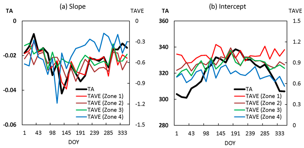 Figure 8 presents the variation of slope and intercept of the dry edge for 2009. Overall, TAVE and TA show similarity in the seasonal pattern of the dry edge. The dry season (April–September) appears to have lower slope and higher intercept than the wet season (October–March), as the maximum Ts values in the dry season are generally higher than those in the wet season. This pattern is less recognizable for Elevation Zone 4 (blue line), as this zone contains a much smaller number of pixels.