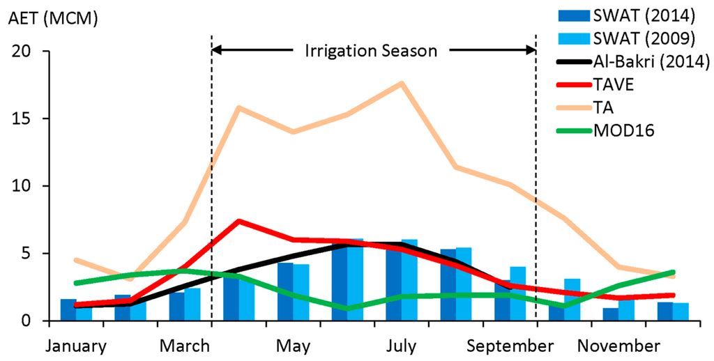 Comparison of monthly AET estimates over the Yarmouk River Basin using TAVE, TA, MOD-16, and SWAT. The red line represents 2009 TAVE monthly estimates. The black line shows the estimated irrigation water consumption in 2014 from a local study [48]. Shown as bars are monthly AET estimates based on SWAT simulation results for 2009 (light blue) and 2014 (dark blue). The dashed black lines show the duration of the irrigation season from April to September for major crops. AET is in million cubic meters (MCM).