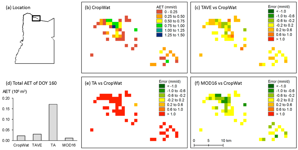 Comparison of different daily AET estimates for an irrigated region on April 9th (DOY 160) of 2009. (a) shows the location of the Yarmouk River Basin. (b) presents the pixel-level AET estimate (mm/day) calculated by the single crop coefficient method using CropWat, assumed to be a proxy for the ground truth. (c) shows the absolute error of the estimates by TAVE to (b). (d) compares the basin-wide total AET estimates (106 m3/day) calculated by multiplying the pixel-level AET rate (mm/day) by the size of a pixel (km2). (e,f) show the absolute errors of the estimates by TA and MDO16 to (b), respectively.