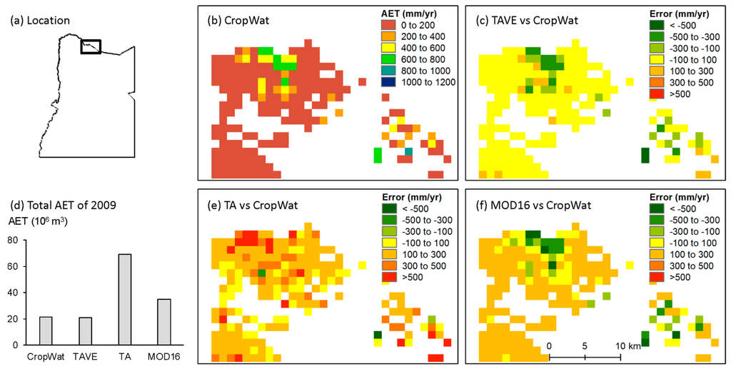 Figure 10 and Figure 11 present results for the eastern portion of the Yarmouk River Basin, where over 90% of the agricultural lands are irrigated. Figure 10 shows the comparison of four types of AET estimates by TAVE, TA, MOD16, and CropWat on 9 June 2009. This date was selected as it was cloud free and near the peak-NDVI date for several major crops in Jordan during the irrigation season. The selection of images was introduced above in the section Study Area and Data. In terms of the total AET (Figure 9b), TAVE is comparable to CropWat (+38%), in contrast to the substantial overestimation by TA (+474%) and underestimation by MOD16 (−94%). The overestimation by TA is larger than 1 mm/day across all pixels (Figure 9d); the underestimation by MOD16 is as much as 0.93 mm/day, particularly evident in areas with intensive irrigation (Figure 9c). The sound performance of TAVE is further demonstrated at the annual level (Figure 11). The CropWat-derived total AET is well matched by TAVE (−3%), in contrast to the substantial overestimation by TA (+234%) and underestimation by MOD16 (−50%). In terms of spatial pattern, the intensively-irrigated areas remain overestimated by TA and underestimated by MOD16, but both of them tend to yield underestimations for sparsely-vegetated areas. Overall, the results indicate that TAVE works well in agricultural irrigated lands in a semi-arid region, where TA and MOD16 greatly overestimate and underestimate AET, respectively.