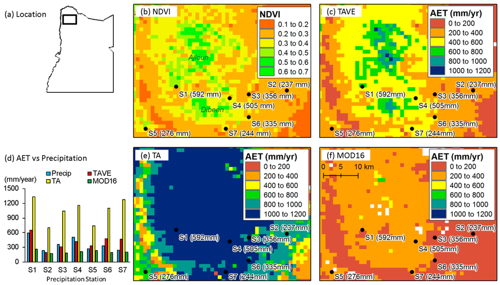 Evapotranspiration in arid and semi-arid regions is a water-limited process. In areas with deep water tables and without irrigation, the annual precipitation was shown to approach the annual AET rate [53]. Here we compare different AET estimates to the precipitation in the Ajloun and Dibeen Forest Reserves in the study area (Figure 12). These forests show high NDVI values and irrigation is negligible in this mountainous region with the water table deeper than 110 m [54]. Rainfall observations are available in this region at seven weather stations that cover a variety of elevation and vegetation conditions. Across different weather stations (Figure 12b), TAVE’s estimates are more comparable with annual precipitation. The mean deviations of TAVE, TA and MOD16 results with observed precipitation are 44 mm, 684 mm and −153 mm, respectively, and the root mean square errors (RMSE) are 0.31 mm day−1, 1.94 mm day−1 and 0.52 mm day−1, respectively. This result is comparable to the range of RMSE reported for triangle methods [35] and MOD16 [55]. In terms of the spatial distribution of AET, TAVE captures the boundary of forests and reflects the variation in annual precipitation. TA results substantially exceed the maximum observed annual precipitation, and MOD16 results show little variation despite the observed precipitation heterogeneity.