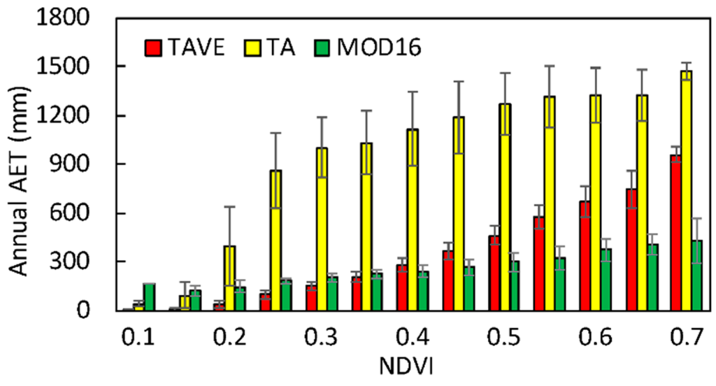 We compare the annual AET estimates by TAVE, TA and MOD16 across different NDVI intervals over the entire study area (Figure 13). Across the NDVI range of 0.25−0.70, all of the methods are able to address the positive control of vegetation cover on AET rates with comparable spatial patterns, and TAVE appears to occupy a middle ground between TA and MOD16. The estimates given by TAVE are 35%−88% lower than that given by TA. Compared with MOD16, TAVE appears to underestimate AET for low NDVI values and overestimate for high NDVI values. As summarized by Hu et al. [55], MOD16 performs best at sites located in forest regions or in a temperate and fully humid climate; it tends to underestimate AET over poorly vegetated surface in a semi-arid or arid climate such as the Mediterranean, Sahel, Southern Africa regions, and the Central Great Plains of the United States. Additional comparisons between TA, TAVE and MOD16 are presented in the Supplementary Information (Figures S3 to S6). Overall, our results indicate that TAVE is an effective method to correct the overestimation by TA and the underestimation by MOD16.