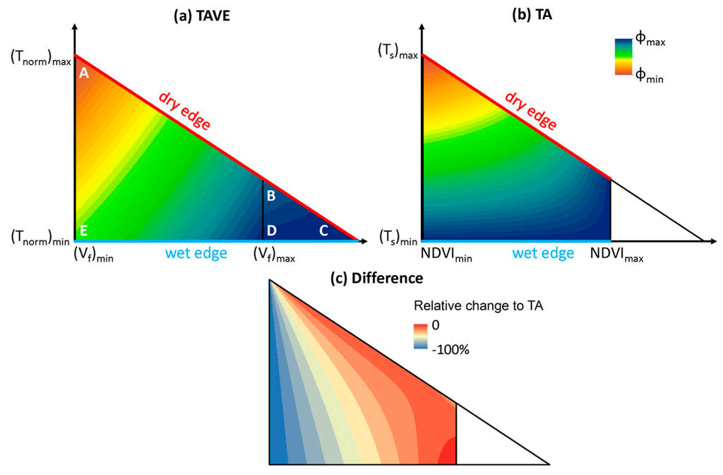TAVE is the first triangle method that introduces a scheme of dual variable edges. On both wet and dry edges, φ linearly increases from a specified minimum value to 1 as vegetation increases from the threshold to the theoretical saturated vegetation condition. To maintain the φ gradient between the two boundary conditions across vegetation intervals, φ increases more quickly on the wet edge and reaches its maximum value at the maximum observed vegetation fraction (Vf = 1). Both dry and wet edges are extended to a hypothetical position. The pixel is assumed to have a sufficient vegetation fraction and the ability to satisfy φmax. Such a configuration leads to significant change in the distribution of φ across the triangle. Compared with the traditional triangle, the TAVE-derived triangle has reduced φ values across the triangle as shown in Figure 14, particularly over low vegetation cover, and shows an enhanced linkage of vegetation condition to φ values.