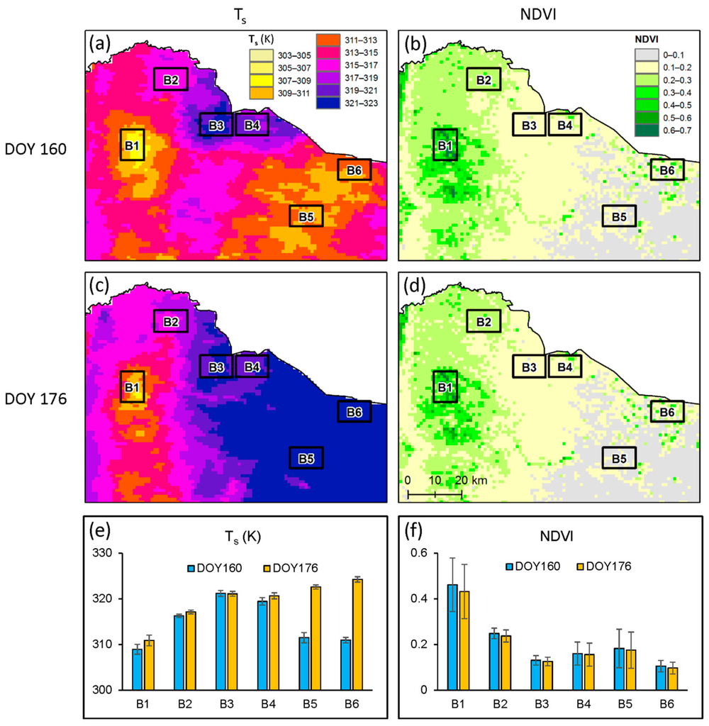 Comparison of NDVI and land surface temperature (Ts) distributions on 9 June (DOY 160) and 25 June (DOY 176), 2009. (a,b) show the distributions of Ts and NDVI for DOY 160, respectively. (c,d) show the distributions of Ts and NDVI for DOY 176, respectively. (e,f) compare Ts and NDVI, respectively, across six representative areas over both dates. The six areas are shown on the maps as black boxes B1−B6, representing forest area (B1), rainfed agricultural land (B2), and irrigated agricultural lands where Ts variation is consistent with NDVI variation (B3 and B4) or inconsistent (B5 and B6). The stable NDVI values over DOY 160 and DOY 176 are consistent with the stable Ts values in B1−B4, but they conflict with the Ts changes observed in B5 and B6, which are likely caused by local weather events instead of evapotranspiration processes over the vegetated surface.
