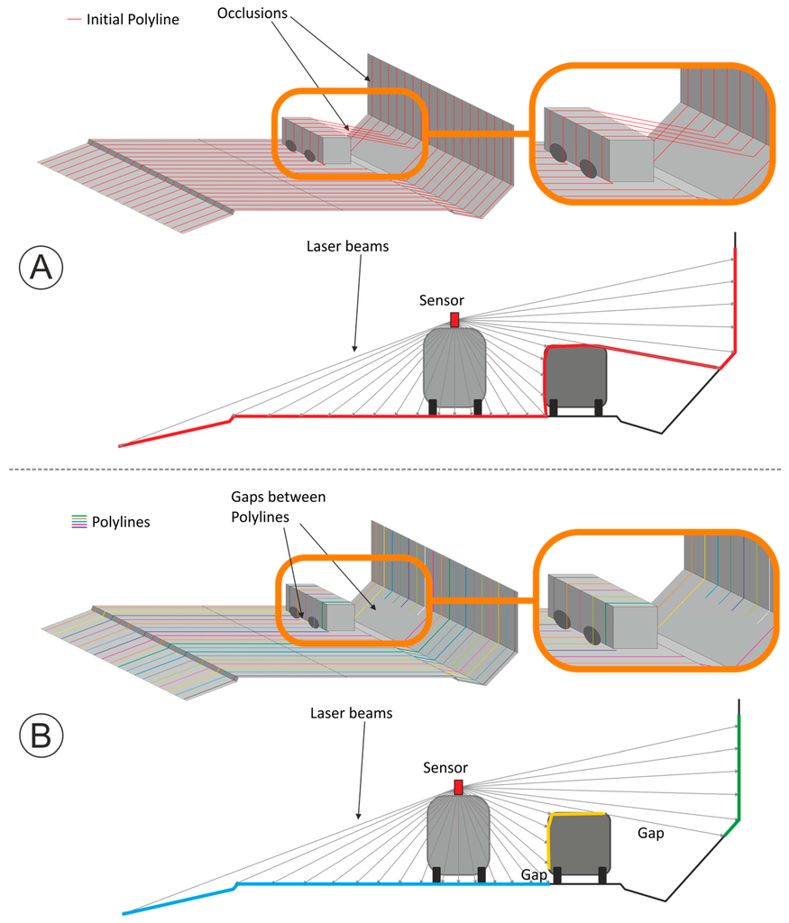 Section 3.1, the distance between consecutive points on the same sweep ranges between 1.5 and 7–8 cm at the road border. These distances are most often 2 cm at the closest road edge and 4–5 cm at the furthest one, and depend on the slant distance to the sensor and the tilt angle of the surface. This explains part of the displacement of the edge line towards the center line of the road (i.e., from a few millimeters to several centimeters).