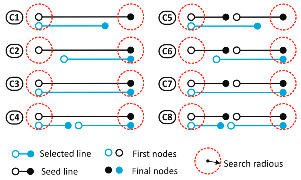 Figure 11 shows the smoothed polyline from the two test datasets and the union of them for three different sections (A, B, and C) of the test road.