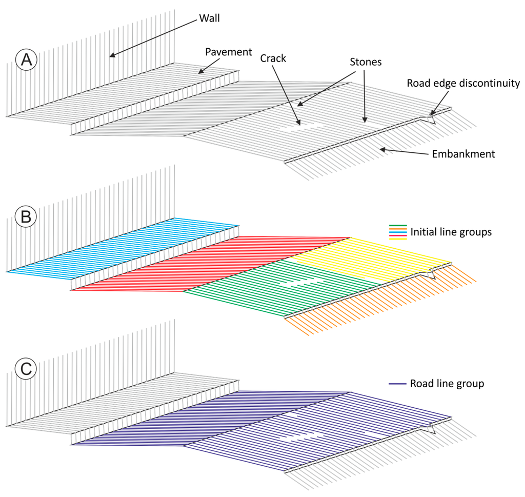 Figure 11 is completely joined to the road polygon from Dataset 1, whereas in Dataset 2, a much smaller patch was joined. In this case, the surface is not completely leveled to the road, and the subtle step is only detected by the algorithm from Dataset 2, in which the west boundary is closer to the trajectory, and the gap between consecutive points is smaller. Using the data from Dataset 1, the step is too shallow if compared with the gap between points, thus, no break in the lines is detected there. The correctness of the union of the two datasets is slightly smaller than the one from Dataset 1 and 2 separately, as the leveled surfaces ‘over-detected’ in only one of them are added to the union.