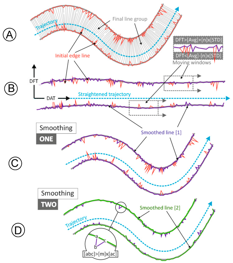 The parameters that control Smoothing 1 are specially interrelated. The window width controls the size of the irregularities in the polyline that the filter smooths, but the rest of the parameters must be set off accordingly (especially the scroll forward step and the threshold for a node to be labeled as an outlier). The (m) value from Smoothing 2 (see