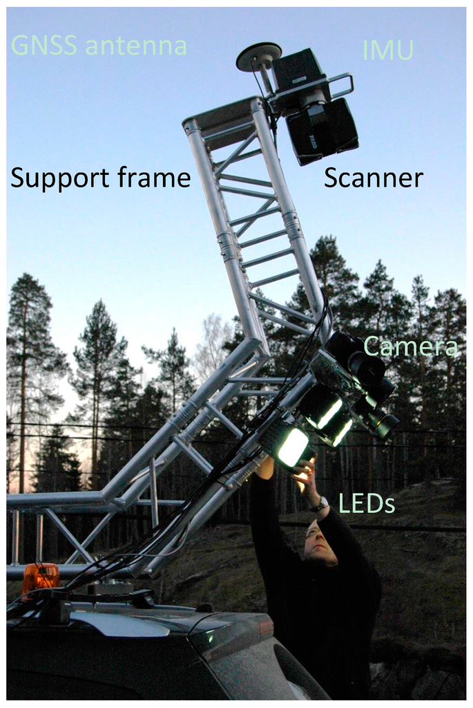 The RoamerR2 system consists of a GNSS-IMU positioning system and FARO Focus 3D 120S laser scanner (FARO Focus3D Features, Benefits & Technical Specifications, Lake Mary, FL, USA) for cross-track profiling of the road environment. The data acquisition and positioning sensors, NovAtel Flexpak6 GNSS receiver, 702GG antenna, and UIMU-LCI IMU (NovAtel Inc., Calgary, AB, Canada), are mounted on a single integration plate that could be mounted on any imaginable support structure, as shown in