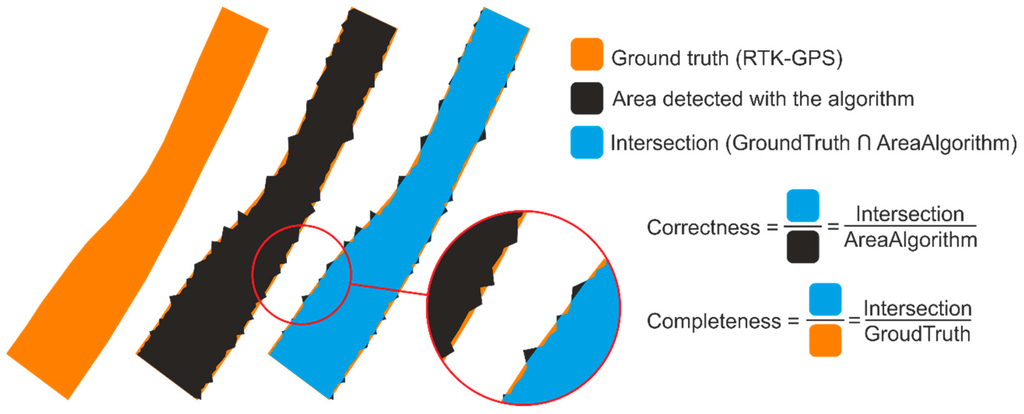The surface misdetection (i.e., surface from the actual road that is not detected by the algorithm: (100%)–(completeness)) could be explained by the joint effect of (i) the fact that the detected road edge tends to be some centimeters inwards of the road; and (ii) the presence of some vehicles on the road while registering data (e.g., the two vehicles shown in