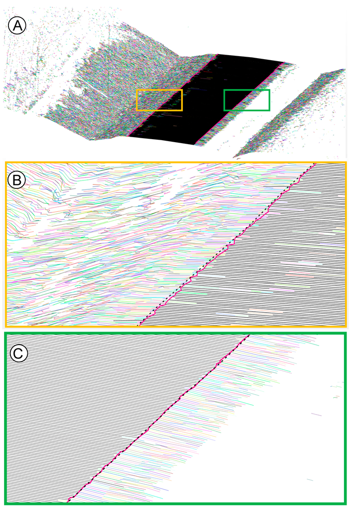 Figure 11C). When using the union of two datasets, the completeness rises to 98%, as (i) the effect of the moving vehicles is eliminated (e.g., the gaps produced by the two vehicles in