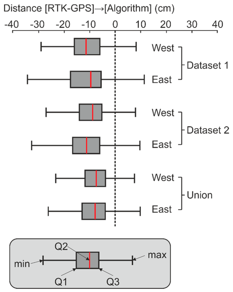 The distances between the RTK-GNSS polyline and the algorithm lines were computed from the measurements on the 426 perpendicular lines. The last two rows from