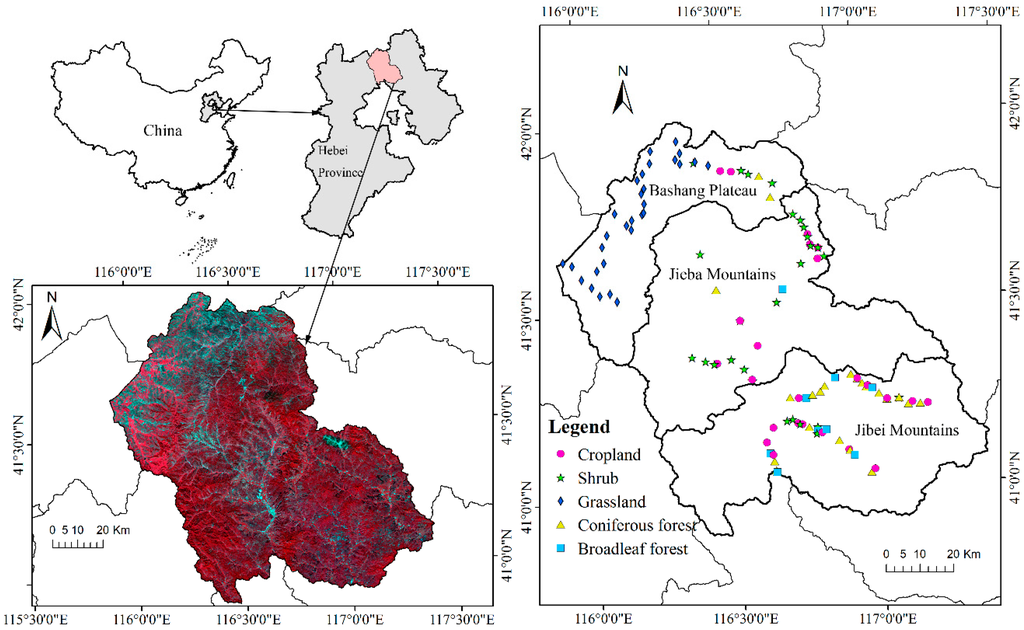 For our case study area, we selected Fengning County, which is located northwest of Chengde City, in China’s Hebei Province (Figure 1). The county is an agro-pastoral ecotone in northern China (40°54′N to 42°01′N, 115°50′E to 117°23′E). The county is 136.5 km wide from east to west, and 122.0 km wide from north to south, for a total area of 8765 km2. This area encompasses an elevation range of 347–2236 masl, and includes the Bashang Plateau in the northwest, the Jieba Mountains, and the Jibei Mountains in the southeast. Fengning County has a semi-humid to semi-arid climate in the mid-temperate continental monsoon zone, with four distinct seasons. The mean annual temperature is 7.2 °C and mean annual precipitation is 457.4 mm in the Baxia area (in the southeast part of the county), versus a mean annual temperature of 2.1 °C and a mean annual precipitation of 416.5 mm in the Bashang area (in the northwest part of the county). Approximately 80% of the annual rainfall occurs between July and August. This area contains a range of land cover and vegetation types, including cropland, deciduous shrubs, grassland (including typical and meadow steppe), coniferous forest, and broadleaf deciduous forest. Crops are cultivated using a single-cropping system, with the land left bare during the fallow season. The dominant planted crops are maize, hulless oat, wheat, flax, sunflower, and potato. Because of its diverse topography and cover types, Fengning County is highly suitable for investigating the method of classification proposed in this study.