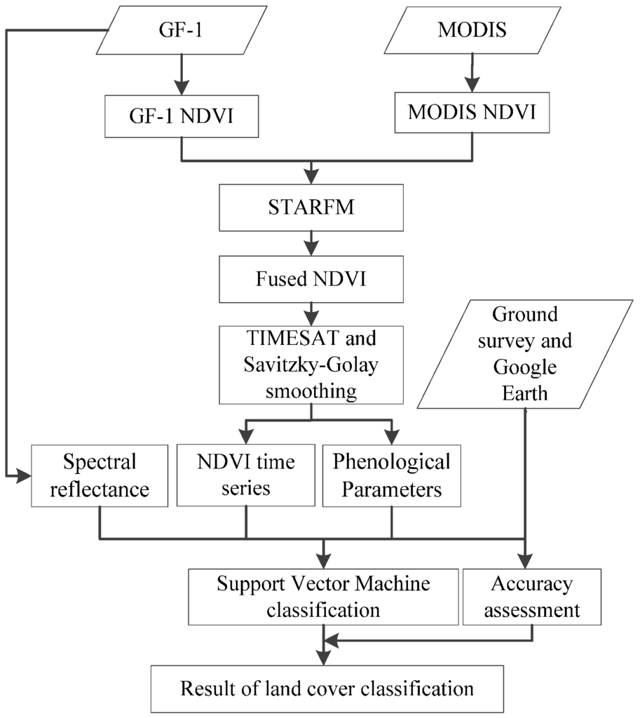 Among these, STARFM is the most widely used. It exploits the complementary aspects of data collected by the MODIS and Landsat sensors to produce fused data with Landsat resolution from MODIS imagery [17]. It has been applied and has performed well in several studies of subjects as diverse as public health [18], forest disturbance and regrowth monitoring [19,20], vegetation phenology analysis [21], efforts to improve land cover classification accuracy [22], and estimation of biophysical parameters such as evapotranspiration [23], leaf area index [24], plant biomass [25], and gross primary productivity [26]. STARFM is not restricted to MODIS and Landsat data, but use of other data sources appears to have been rarely reported [27]. One new data source is GF-1, the first satellite in China’s High-resolution Earth Observation System, which provides data with spatial resolution of 16 m or better. The revisit cycle of GF-1 reaches 4 days when the four sensors are combined. However, the construction of NDVI time-series required sufficient archives of cloud-free images throughout the year, which is highly dependent on the weather permitting. The dilemma in GF-1 data is its irregular availability in day of year, either in the form of occasional missing data or as larger gaps due to unfavorable weather condition. There have been no reports of using the STARFM fusion method to construct an NDVI time series with high spatial and temporal resolution by fusing GF-1 and MODIS data. Thus, it is unclear whether the fused data and the extracted phenological parameters will improve regional land cover classification accuracy.