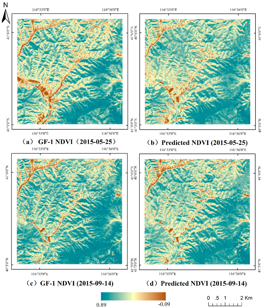 (a–d) Comparisons of the actual GF-1 NDVI images (left) and the corresponding fused images (right) on two dates.
