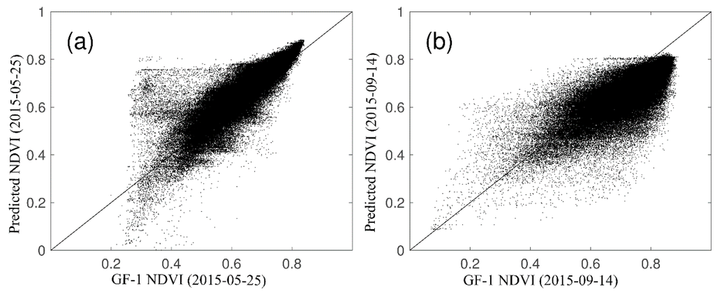 Scatterplots between values from the actual GF-1 NDVI images and the fused NDVI images (using STARFM) on the same date. (a) refers to data on 25 May 2015; (b) refers to data on 14 September 2015. Diagonal lines represent the line y = x.