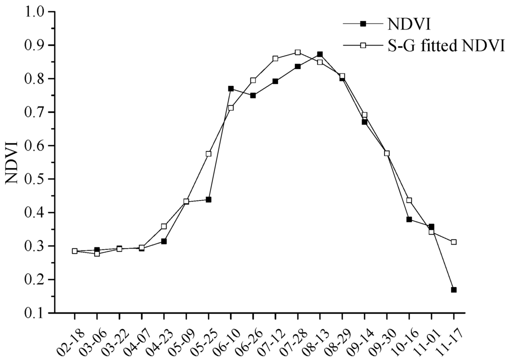 where represents the resultant NDVI value, j is the running index of the original ordinate data table, Ci represents the coefficient for the ith NDVI value of the filter, Y represents the original data value in the time series, and N represents the number of NDVI values for the filtering convolution operators, whose value equals the size of the smoothing window (2m + 1), where m is the half-width of the smoothing window [35]. Parameter selection should provide a good trade-off between preserving temporal detail in NDVI time-series and identifying noisy points [35]. Selecting optimal settings parameters is an act of trial and error [34]. Through repeated experiments, we set the size of the moving window to 4, the adaptive strength to 2, and the number of envelope iterations to 2 in TIMESAT to achieve the satisfactory smoothing effect.