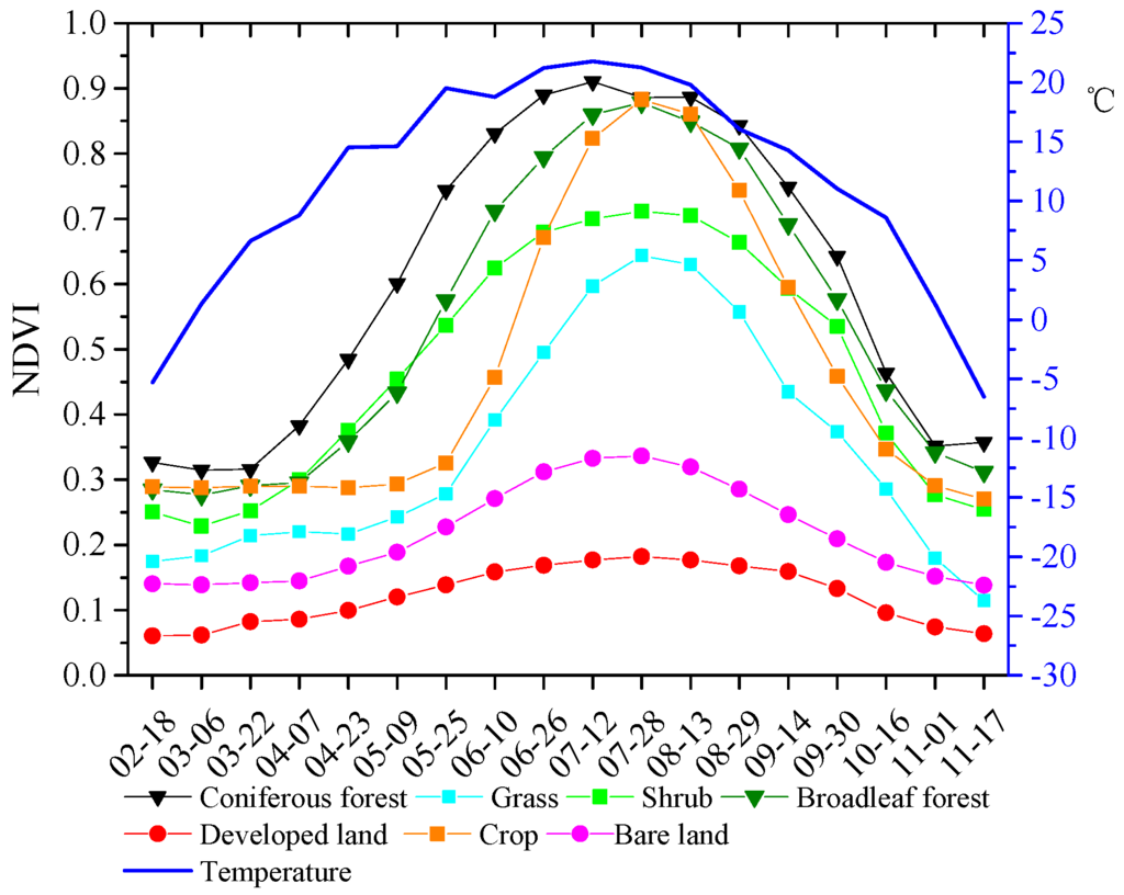 Savitzky-Golay filtering can effectively eliminate the effect of noise in NDVI time series [32,35]. Figure 5 provides an example of the original NDVI time series and the NDVI time series reconstructed using this filtering method for one pixel in a broadleaf forest during the 2015 growing season. The filtering process preserved the trend of the original NDVI data fairly well and the fitted curve better depicted the seasonal variation in vegetation characteristics; it therefore provides reliable data for the extraction of phenological information. Figure 6 shows the NDVI time series of randomly selected pixels of the seven land cover types (except water) based on field surveys and Google Earth data. There were clear differences among the land cover types. Developed land and bare land had low NDVI values, with only slight fluctuation during the study period. Natural vegetation and crops showed a similar trend, with NDVI increasing to one peak value and then decreasing again. The peak NDVI value, the time when it occurred, and the rate of change of NDVI differed among the vegetation types, reflecting phenological differences. We also observed the dynamic of temperature of Fengning county that spanned the growing season from February to November 2015 in Figure 6. It can be clearly seen that the curve of NDVI is similar to that of temperature. All plants started to grow in spring (March to May) as the temperature increased, then the greenness of vegetation increased quickly, reached the maximum value at the most productive stage in summer (June to August), and then the greenness declined rapidly till a low level in autumn (September to November) as the temperature decreased. Plants went into relative dormancy in winter due to the sub-zero temperatures.