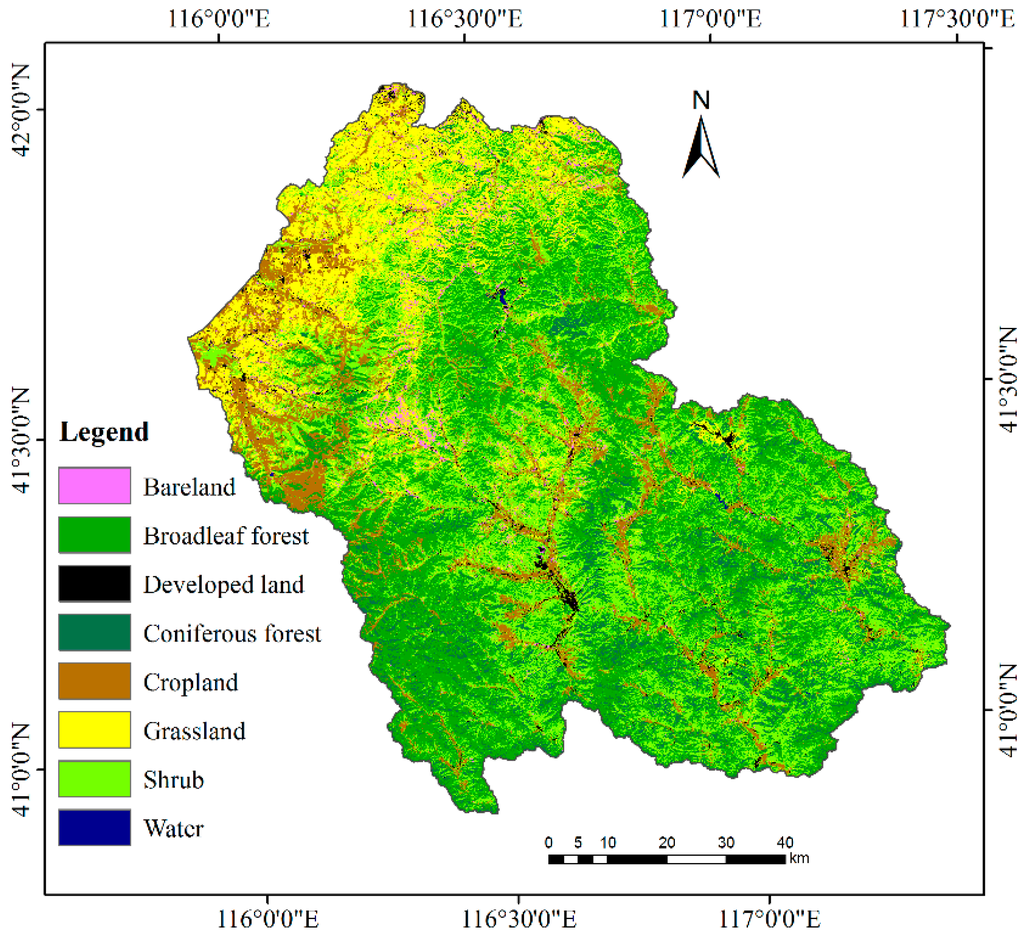 To obtain training and validation samples for the land cover classification in the study area, we carried out field surveys during the period from July 2015 to August 2015. We used Trimble GeoExplorer 6000-series hand-held GPS receivers to record the geographical coordinates of the study sites (with a 2D precision of ±1 m) and the corresponding land cover types at the survey sites. In total, we surveyed 115 field sites in relatively homogeneous regions; that is, the land cover was homogeneous within 100 m around the survey sites. The survey comprised 33 forest sites, 28 shrub sites, 30 grass sites, and 24 crop sites (Figure 1). The forest sites consisted of 26 coniferous forests and 7 broadleaf forests.