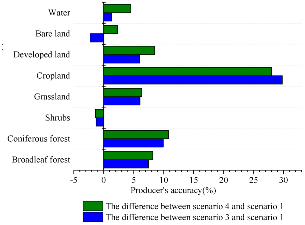 The differences of producer’s accuracy between scenarios.